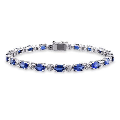This pretty Created Blue Sapphire and Diamond Accent Tennis Bracelet, offers an enchanting look for romantic occasions. Crafted in sterling silver, this stunning bracelet features oval cut created blue sapphire gemstones and two prong set diamonds. This exquisite 7.25 inch bracelet is comfortably secured with a pressure tongue clasp.