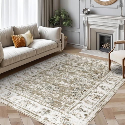 9 x 12 Area Rug - Vintage Distressed Rug Floral Taupe Print Rug Living Room Rug Washable Rug Bedroom Rug Non Slip Backing Rug Retro Low Pile Rug Thin Rug Farmhouse Carpet