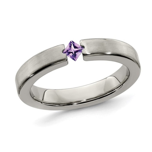 Cette alliance est tout simplement l'objectification de l'élégance et de la dignité. Sculptée en titane brossé, cette bague de 4 mm vous aidera à passer une vie heureuse ensemble. Au centre de la bague se trouve une améthyste violette carrée 3 mm, la pierre de naissance du mois de février.