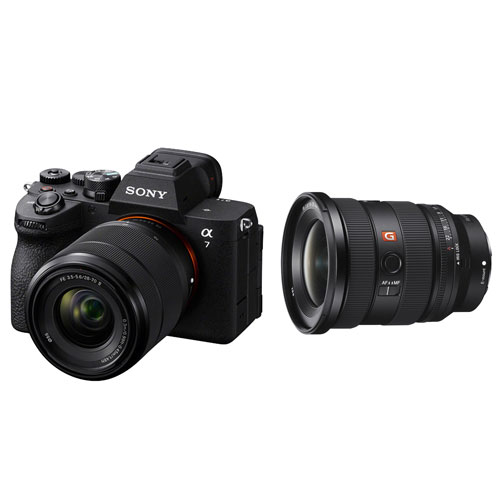 Immortalisez du contenu éclatant grâce à cet ensemble de Sony, qui comprend l'appareil photo Alpha 7 V, un objectif de 28-70 mm et un objectif plein format à monture E FE 16-35 mm f/2,8 GM II.