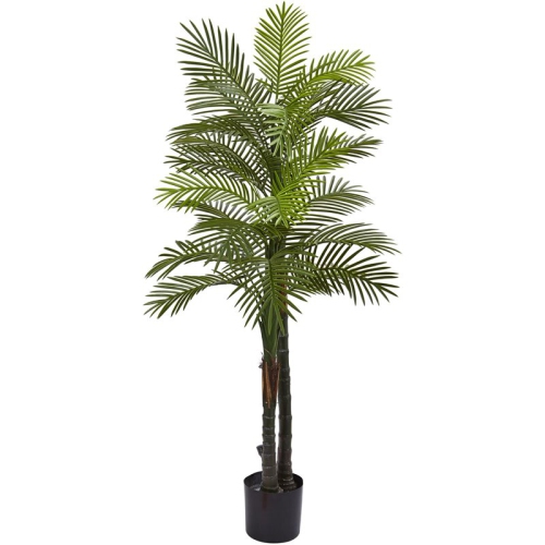 Orné de 29 fausses feuilles résistantes aux rayons UV, le palmier double Robellini de 5.5 pi de haut offre une apparence tropicale qui dure toute l’année.