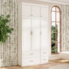 Armoire garde-robe moderne blanche avec tiroirs et armoire supérieure Famapy – Solution de rangement élégante avec poignées dorées au sable et tringle de suspension intégrée