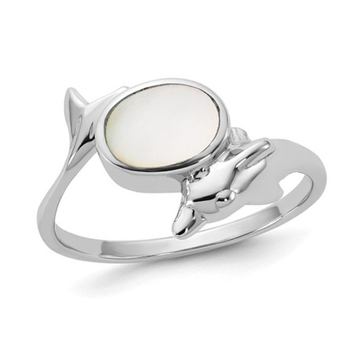 Cette bague est magnifiquement mise en valeur par une lunette en nacre lisse sertie dans une magnifique base en argent sterling poli avec un motif de dauphin unique. Cette bague moderne et avant-gardiste est à la fois abordable et élégante.