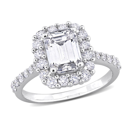 Faites-vous remarquer avec notre bague de fiançailles en argent sterling poli avec moissanite à taille octogonale. Cette superbe bague est ornée d'une moissanite octogonale, totalisant 2 3/8 ct (ct), sertie sur de l'argent sterling élégant. Son design halo unique et son éclat brillant en font un bijou qui en met plein la vue en toute occasion.