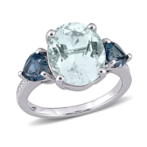 Cliquez ici pour vous aider à trouver la taille de votre bague. Cette bague originale et lumineuse en argent sterling avec aigue-marine, topazes bleues londoniennes et diamants est dotée d’une aigue-marine ovale à taille centrale, jumelée à des topazes bleues londoniennes à taille coeur et à des diamants ronds dans un magnifique centre à trois pierres. Inspiré par les tons pastel combinés avec élégance et éclat, il ajoute instantanément une touche de