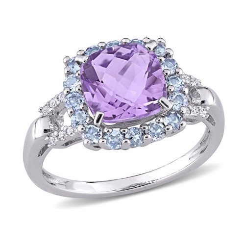Cette élégante bague cocktail améthyste, tanzanite et diamant ajoutera une touche d’éclat attrayante à votre tenue. Faite d’argent sterling lustré, la bague comporte une améthyste à taille coussin au centre et des tanzanites rondes (2 mm) avec 12 diamants ronds sertis en coupe sur les côtés.