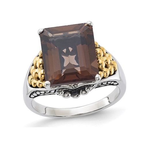 Cette superbe bague est ornée d'un grand quartz fumé à taille émeraude (4,00 carat) serti à griffe dans de l'argent sterling poli pour compléter l'apparence de cette bague avec pierre précieuse brune juteuse.