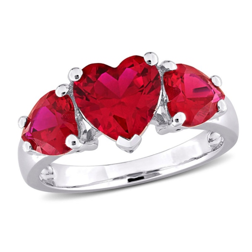 Attirez l'attention et soyez romantique avec notre bague en argent sterling avec rubis synthétique en laboratoire à trois pierres en forme de coeur 4 4/5 carat (ct). Cette superbe bague est ornée de trois rubis synthétiques en forme de coeur d'un poids total de pierres précieuses de 4 4/5 ct, pour un style captivant et symbolique. La teinte rouge intense des rubis ajoute une touche de passion et d'élégance à la pièce. En argent sterling, les trois