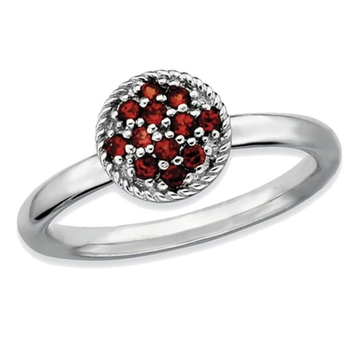 Cette bague à grappe empilable classique est dotée de magnifiques grenats rouges naturels au placage rhodium sur une base élégante en argent sterling.