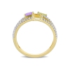Obtenez un style de fête coloré et captivant avec cette somptueuse bague à trois rangées avec péridot vert, améthyste violette, citrine jaune et topaze blanche. Faite d'argent sterling plaqué or jaune lumineux plaqué or flash, cette superbe bague est ornée d'un péridot, d'une améthyste et d'une citrine à taille baguette (4-2 mm) et de 73 topazes blanches à taille ronde et à sertissure à griffes (1-1 mm). Fini poli.