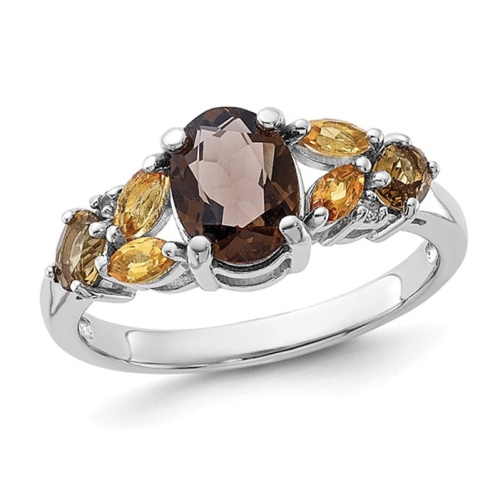 Une seule pierre précieuse ovale brun quartz fumé est au centre de cette bague spéciale, alors que 4 citrines et 2 quartz à whisky soutiennent le joyau brun des deux côtés. Cette magnifique bague ornée de pierres précieuses est faite d’argent sterling poli. Le poids total des pierres précieuses de cette bague est de 1.60 ct.