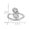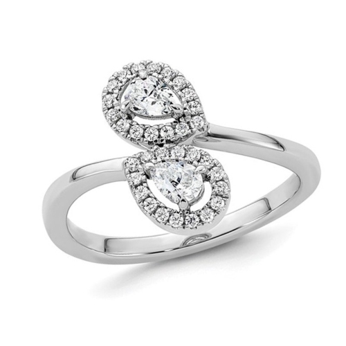 Cette bague simple et magnifique est ornée de deux diamants en forme de poire, chacun dans un halo de diamants qui soutiennent ses caractéristiques principales. Fabriquée en or blanc 14 ct poli et éclatant, cette bague offre de l'élégance au bon prix. Le poids total en carat de cette magnifique bague de dérivation est de 2/5 carat (ct). Cette bague n'est disponible qu'en taille 7.