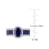Obtenez une allure de soirée impressionnante avec cette élégante bague à halo en saphir bleu synthétique en laboratoire et en saphir blanc synthétique en laboratoire. Faite d'argent sterling poli, cette bague opulente est dotée d'un saphir bleu synthétique à taille ovale serti à griffe (8 x 6 mm) au centre, tandis que 12 saphirs bleus synthétiques à taille baguette sertis en bande (4 x 2 mm) et 56 saphirs blancs synthétiques ronds à sertissage à griffe (1,25 x 1,25 mm)