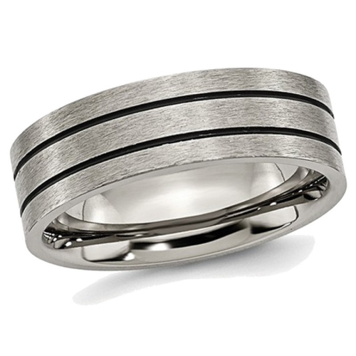 Cette alliance striée de 7 mm est faite de titane poli éclatant orné de rainures décoratives noires. Élégante et raffinée, cette bague est un accessoire classique qui durera toute une vie.