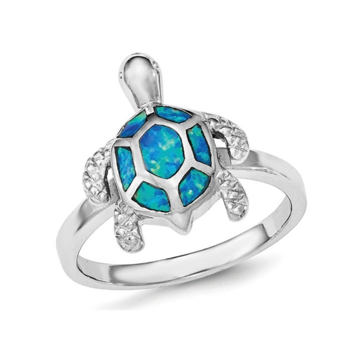 Bague tortue en argent sterling, opale bleue synthétique et rhodium