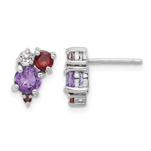 Ces boucles d'oreilles à pendentif en argent sterling poli avec la pierre de naissance de février et de janvier, une améthyste violette ronde et un grenat rouge riche rond, contrastent avec une minuscule topaze blanche pour un poids total de pierres précieuses de 1,64 ct.