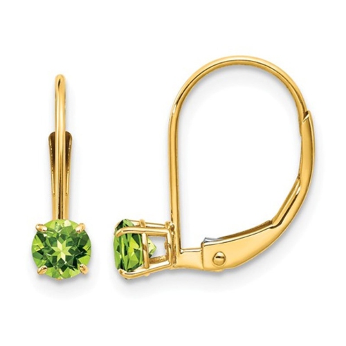 Boucles d'oreilles chatoyantes en or jaune 14 carats avec fermoirs à levier et péridots verts ronds 4 mm. Le péridot vert est la pierre de naissance du mois d'août.