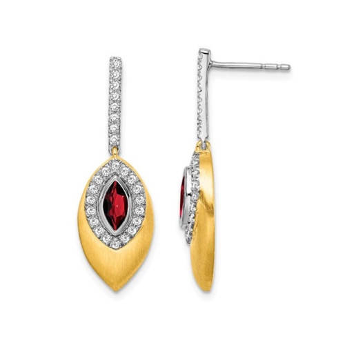 Ajoutez une touche de charme à n'importe quelle tenue avec ces pendants d'oreilles en forme de grenat rouge naturel en or jaune et blanc 14 ct (0,700 ct) chatoyant. Arborant la pierre de naissance du mois de janvier, cette paire élégante et polyvalente vous permettra de toutes les occasions avec style. Ces boucles d'oreilles pendantes au design unique sont ornées de diamants ronds blancs brillants de 3/10 en ct ajoutant un peu plus de élé