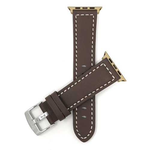 Bracelet de montre en cuir à coutures brunes/blanches Bandini pour Apple Watch 46 mm/49 mm/45 mm/44 mm/42 mm (série 3), Ultra 1, Ultra 2, série 11, série 10, série 9, série 8, série 7, SE, série 6, Série 5, série 4, série 3, série 2, série 1 pour hommes et femmes (unisexe) - bolide épais - adaptateur connecteur doré