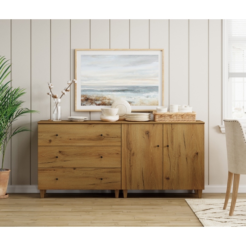Buffet 2-en-1 WAMPAT avec 2 portes et 3 tiroirs, armoire de rangement moderne de bahut de 70,8 po, table basse avec rangement pour la cuisine, salle à manger, chêne brun