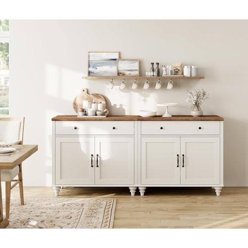 Buffet WAMPAT 2-en-1 avec portes et tiroirs, armoire de rangement en bois large, organisateur de rangement champêtre en bois pour garde-robe, console pour salon, salle à manger, blanc