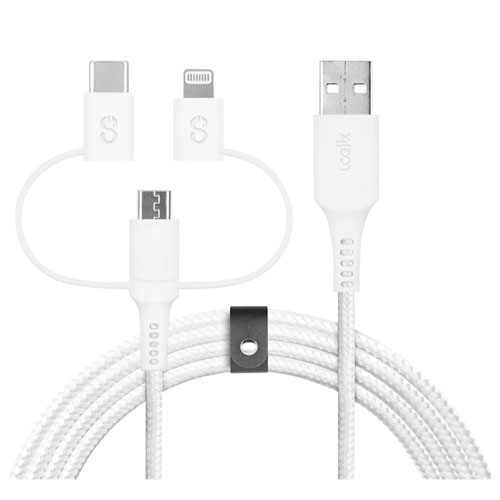 Le câble USB-A à USB-C/micro USB/Lightning de 1,5 m de LOGiiX est une solution de chargement polyvalente pour vos besoins en synchronisation et en chargement. Ce câble polyvalent trois-en-un tissé mesure 1,5 m et comprend des connecteurs USB-A à Lightning, micro USB et USB-C pour assurer la compatibilité avec une tonne d'appareils. Son design tissé et ses connecteurs résistant à la tension préviennent efficacement l'effilochage et les dommages.