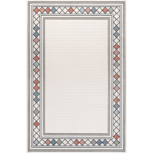 Ce tapis est doté d’une palette de couleurs moderne et d’une bordure géométrique audacieuse avec un champ central rayé. Avec son motif occupé pour les enfants, notre tapis texturé est idéal pour une cuisine, un salon, un bureau ou une véranda. Les fibres synthétiques pour l'intérieur et l'extérieur conviennent aux animaux de compagnie et sont faciles à nettoyer.