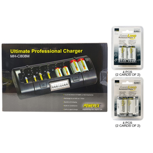 Chargeur ACL à 8 baies MH-C808M de Powerex + 4 C (4500 mAh) + 4 D (10000) batteries AccuLoop NiMH AccuPower.