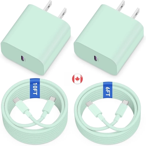 Chargeur USB-C pour iPhone 17/16/15/15 Plus/15 Pro/15 Pro Max, paquet de 2; Adaptateur de bloc chargeur mural rapide 20 W pour iPad Pro 12.9/11 po, iPad Air, iPad mini [6 pi]; Câble USB-C à C |Vert