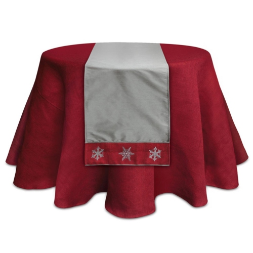 Chemin de table de Noël à motif de flocons de neige gris et rouge. Motif de flocons de neige brodés sur les bords. Modèle à un côté et nettoyer les taches seulement; recommandé pour une utilisation à l'intérieur