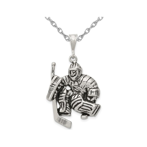 L'argent sterling antique est conçu pour former un gardien de but de hockey avec des coussinets suspendus, qui comprend une chaîne en or 18 po assortie. Cet article a une longueur d'environ 1 1 mm/5 po et une largeur de 1 po et pèse 5,15 grammes.