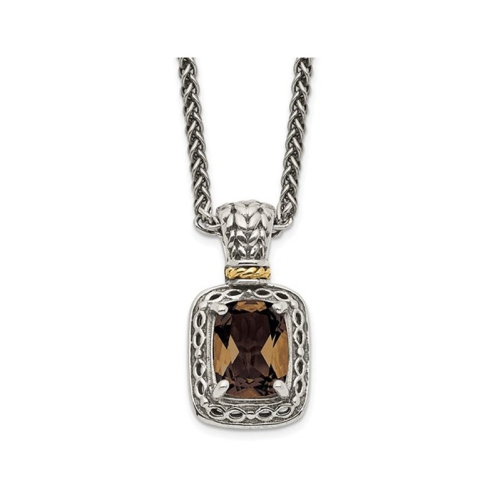 Un quartz fumé à taille coussin de 2.00 ct est serti sur de l’argent sterling au fini antique. Ce pendentif à dos galerie est suspendu à une chaîne au fini antique de 18 po.
