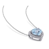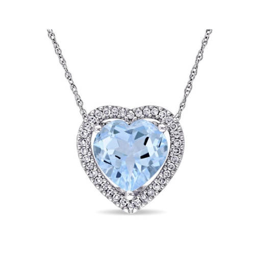Ce chatoyant collier en forme de coeur est doté d'une topaze bleu ciel en forme de coeur entourée d'un halo de 36 diamants blancs ronds sertis sur de l'or blanc 10 ct éclatant. Ce pendentif est accroché à une chaîne torsadée sécurisée par un fermoir à anneau à ressort. Ce magnifique pendentif est d'une grande féminité et ne manquera pas de vous faire paraître fabuleux.