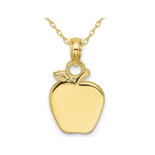 Ce pendentif de pomme chic et joyeux est façonné dans une finition brillante or jaune brillante de 10 karat. Complet avec une chaîne en or correspondante, cela fera un charme polyvalent pour l'usure quotidienne. Le charme mesure 1/2 pouce de longueur et 1/5 pouce de largeur et pèse 0,900 grammes.