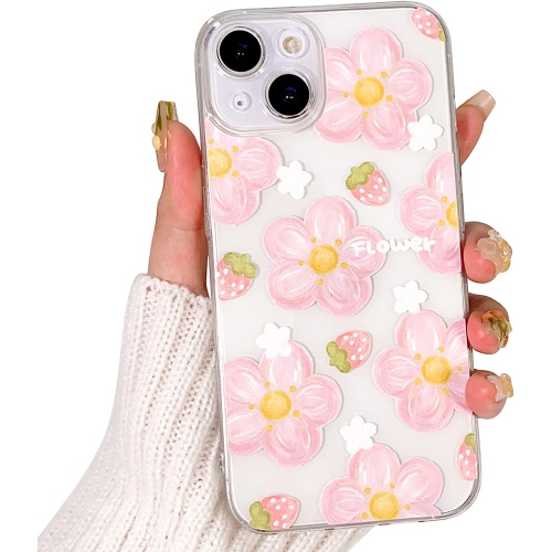 Compatible avec l'étui iPhone 13 Cute Clear Oil Flower Floral Strawberry Design pour filles Soft TPU