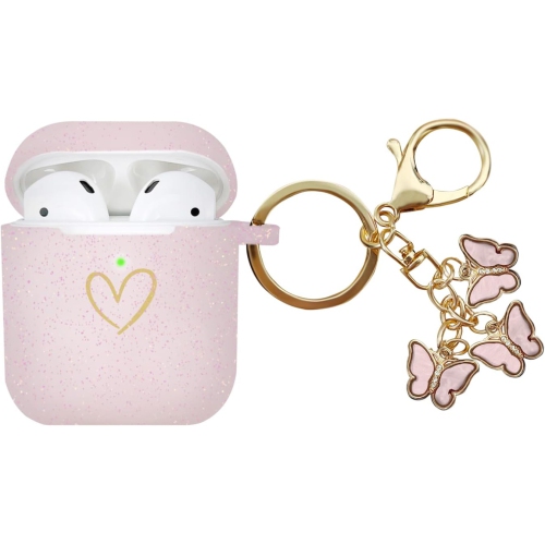 Compatible avec l'étui AirPods, l'étui en silicone souple avec motif de coeur doré pour AirPods 2 et 1e génération avec porte-clés mignon papillon pour filles (rose doré)