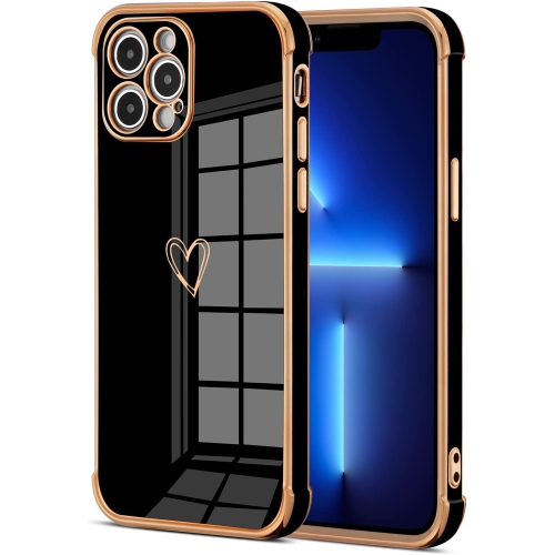 Compatible avec l'étui Pro 13 de iPhone avec coeur doré, bordure en placage de luxe, étui mignon avec objectif pour appareil photo complet