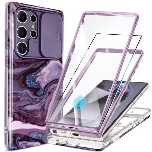 Compatible with Samsung Galaxy S24 Ultra Case with Slide Camera Cover+Screen Protector, 2 Front Frames 360° Armor Fullbody Shockproof Bumper Protective Marble Case 6.8",