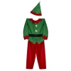 Costume de Noël, lutins, garçon. Le chandail lutin est vert avec des accents dorés. Le pantalon est rouge vif et un chapeau assorti est offert