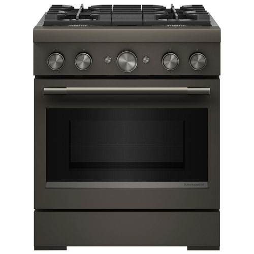 Embellissez votre cuisine avec la cuisinière biénergie de style commercial de 30 po Gallery de KitchenAid, conçue pour stimuler votre créativité quand vous faites à manger à la maison. Profitez de la surface de cuisson à gaz pour obtenir un contrôle précis et du four électrique à convection véritable Even-Heat pour parvenir à des résultats toujours délicieux. Le mode de friture à l'air et les quatre brûleurs polyvalents offrent plusieurs options pour préparer n'importe quel repas.Cuisinière biénergie 4 brûleurs avec convection véritable et friture à l'air 4,1 pi³ 30 po de KitchenAid (KFDS930SBE) - Minerai noir
