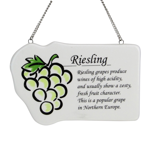 Décoration de Noël en forme de plaque blanche « Reisling » en forme de vin. Prêt à suspendre avec une chaîne en argent. Décoration à arrière plat sur un côté; usage intérieur seulement