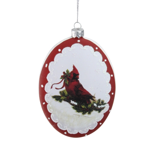 Bonhomme de neige avec décorations de Noël en forme de cardinaux. Ornement orné de paillettes iridescentes. Il est prêt à être accroché à un cordon argenté