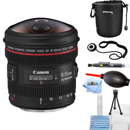 Objectif zoom ultra grand-angle USM EF 8-15 mm f/4 L de CanonDescription courtemonture EF de série Louverture de l'objectif : f/4-22Ultra-Low dispersion et verre asphériqueangle de vue diagonal de 180°produit des images circulaires et plein formatmoteur de mise au point automatique ultrasoniquefonction de limiteur de zoomrevêtement de structure de sous-longueur d'onderésistant à la poussière et à l'humiditérevêtement protecteur de lentille de fluorine