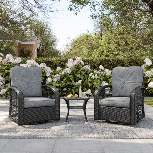 Ensemble de 3 chaises berçantes en osier pivotant à 360° Maybelle de CorLiving avec coussins gris pour la cour, le jardin, le balcon ou le porche