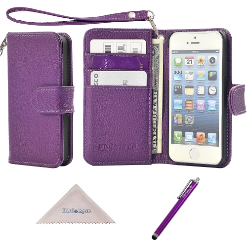 Étui iPhone SE 5s 5, étui portefeuille [folio à rabat] protecteur en cuir pu 2-en-1 de qualité supérieure avec plusieurs fentes/fentes pour cartes de crédit et dragonne pour iPhone se/5s/5 d’Apple (violet)