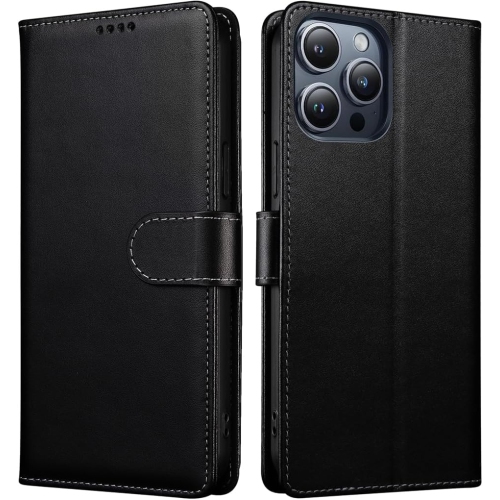 Étui-portefeuille pour iPhone 15 Pro en cuir véritable avec béquille antivol à blocage RFID, solide fermoir magnétique