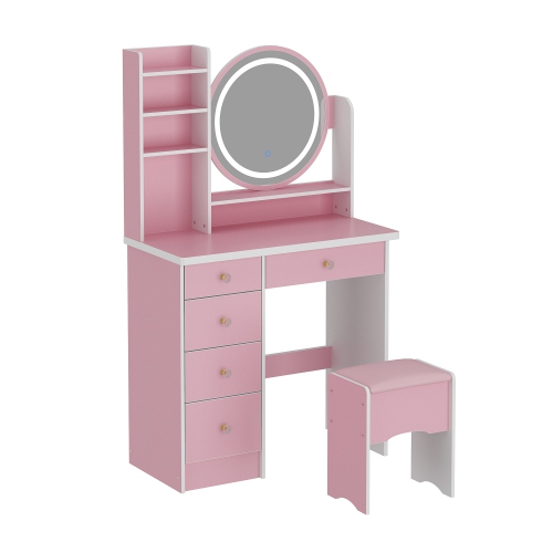 Famapy Vanity Desk Set Makeup Table with Large Lighted Mirror, Dressing Table with 5 Drawers, Storage Shelves & Cushioned Stool for Bedroom(31.5" W x 15.7" D x53.1" H) Pink
