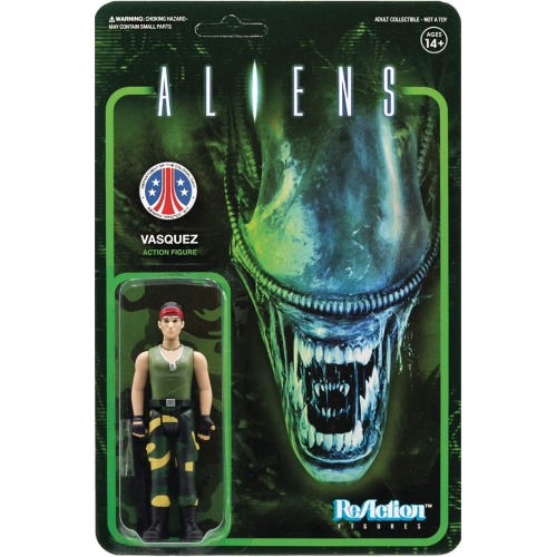 Aliens est l'un des films préférés de Super7 et il rejoint maintenant le monde des figurines de réaction de 3 3/4 po! « LE ROCK! » Vasquez, le badass Colonial Marine, est armé d'un Smartgun. Emballage de la plaquette thermoformée.