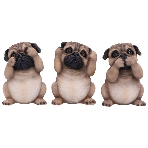 • Trois figurines de carlins qui rendent un hommage humoristique à la célèbre pensée de Confucius disant qu'il ne faut rien voir, rien entendre et rien dire de mal