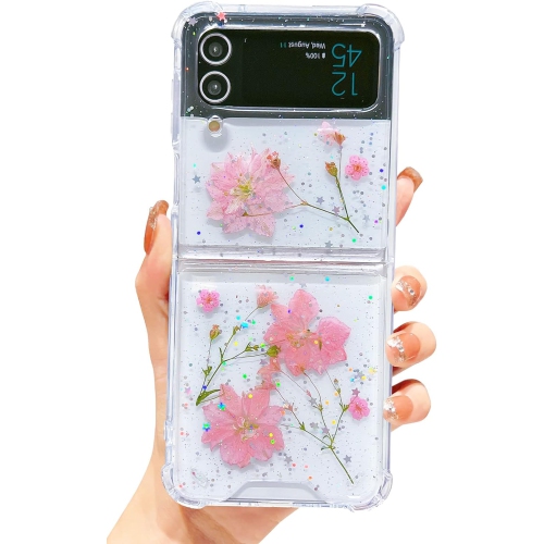 for Samsung Galaxy Z Flip 4 5G Case Clear with Design Glitter Cute Glitter Pressed Flower Floral Sparkle TPU&PC